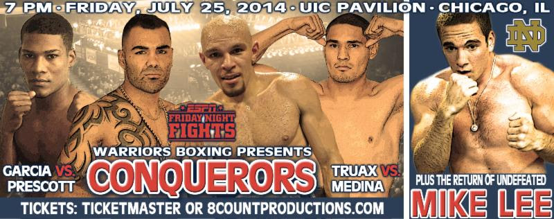 On Friday, July 25, 2014, Leon Margules (Warriors Boxing), Dominic Pesoli (8 Count Productions), Tony Grygelko (Seconds Out Promotions) and Julio Marines (Marines Promotions) proudly present “Conquerors”, an ESPN Friday Night Fights tripleheader, to be broadcast worldwide, live, from Chicago’s UIC Pavilion.
