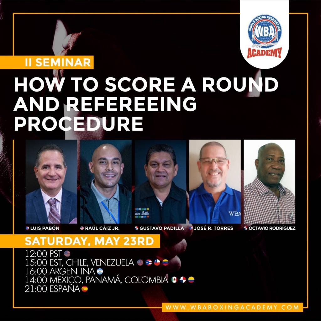 Este nuevo seminario se llevará a cabo a partir de la 2:00 pm en Colombia, 3:00 pm en el Este de Estados Unidos, 12:00 pm en el Pacífico y 8:00 pm en el Reino Unido; será vía online al igual que el primero. Las inscripciones están abiertas a través del portal www.wbaboxingacademy.com para todos los interesados en recibir el seminario. El mismo está denominado “Cómo evaluar un asalto y procedimiento arbitral” y será dictado por personal calificado como Gustavo Padilla, Luis Pabón, Raúl Cáiz Jr., Octavio Rodríguez y Roberto Torres, todos de amplia experiencia internacional.