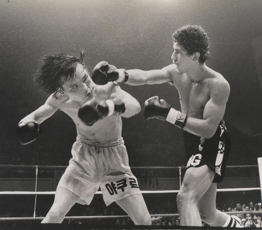 Wilfredo Gómez, a la derecha, intenta golpear a Dong Kyun Yum durante el combate que ambos protagonizaron el 21 de mayo de 1977 en el coliseo Roberto Clemente de Hato Rey. (GFR Media / Ramón Korff)
