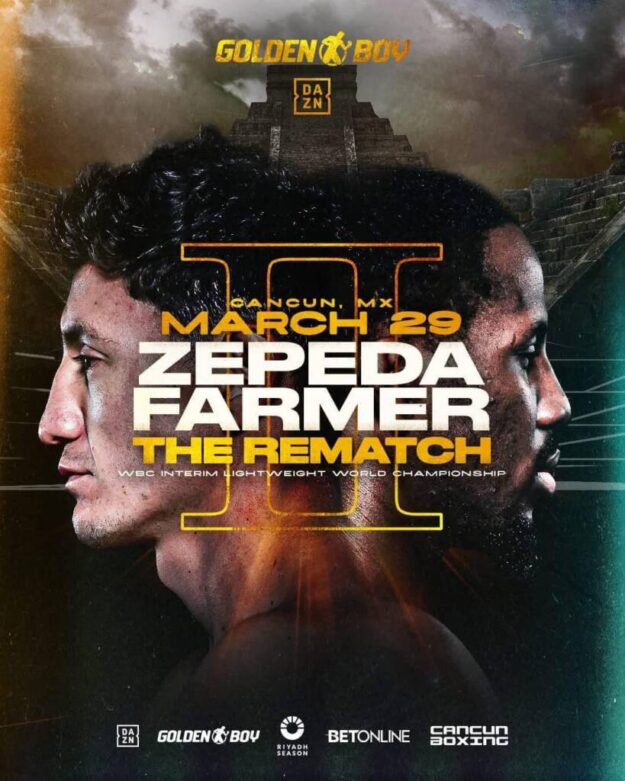 Zepeda y Farmer volverán a medirse en un ensogado, luego del enfrentamiento que sostuvieron el pasado 16 de noviembre en Riad, Arabia Saudita, donde el ídolo de San Mateo Atenco, Estado de México, logró reponerse de una caída y alzarse con una victoria por la vía de la decisión dividida, que le permitió obtener el campeonato interino del Consejo Mundial de Boxeo (WBC, por sus siglas en inglés), de peso ligero.