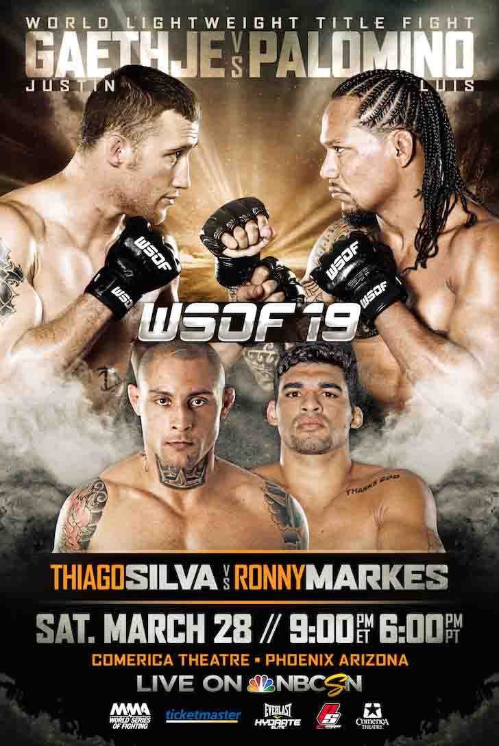 LAS VEGAS (February 6, 2015) – The highly-anticipated, live NBC Sports Network (NBCSN) televised WSOF 19: Gaethje vs. Palomino world championship Mixed Martial Arts (MMA) event headlined by a lightweight (155 pounds) title fight and featuring the first stage of a star-studded, four-man light heavyweight (205 pounds) tournament will head to the Comerica Theatre in Phoenix, Ariz. on Saturday, March 28.
