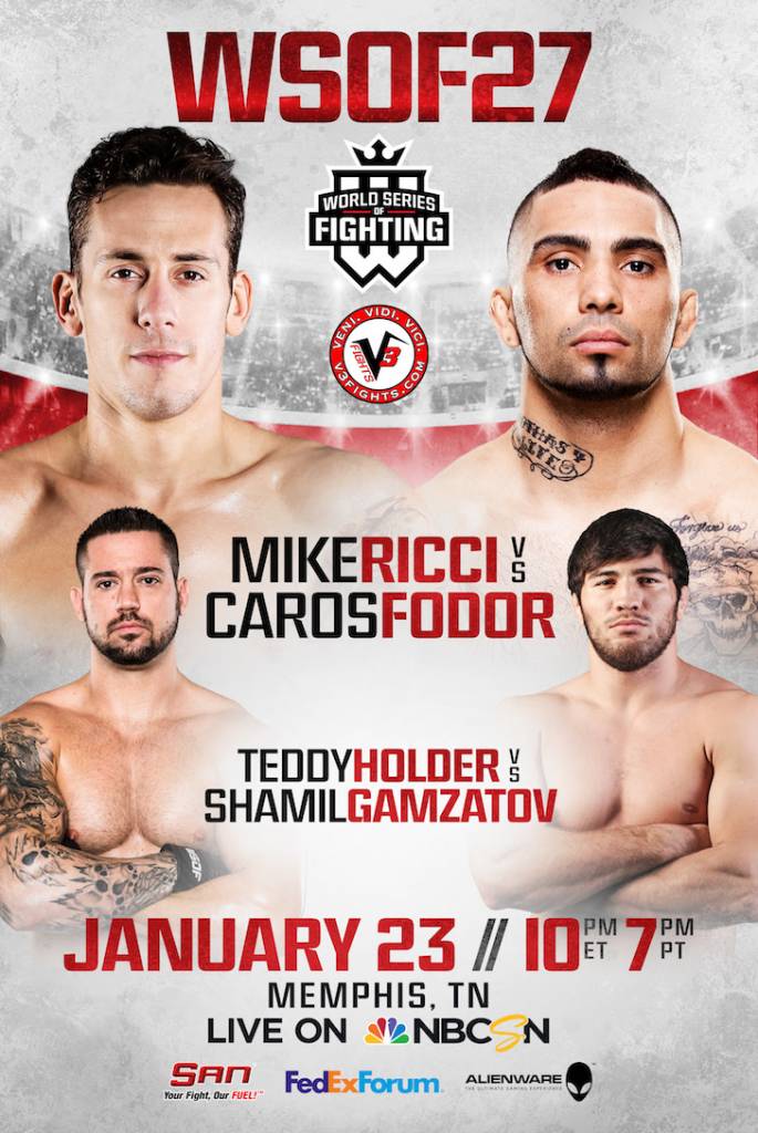 LAS VEGAS (January 6, 2016) –World Series of Fighting (WSOF.com) announced today a trio of preliminary card bouts that will complete its lineup for WSOF27 at the FedExForum in Memphis, Tenn. on Saturday, Jan. 23, live on NBCSN at 10 p.m. ET/7 p.m. PT.