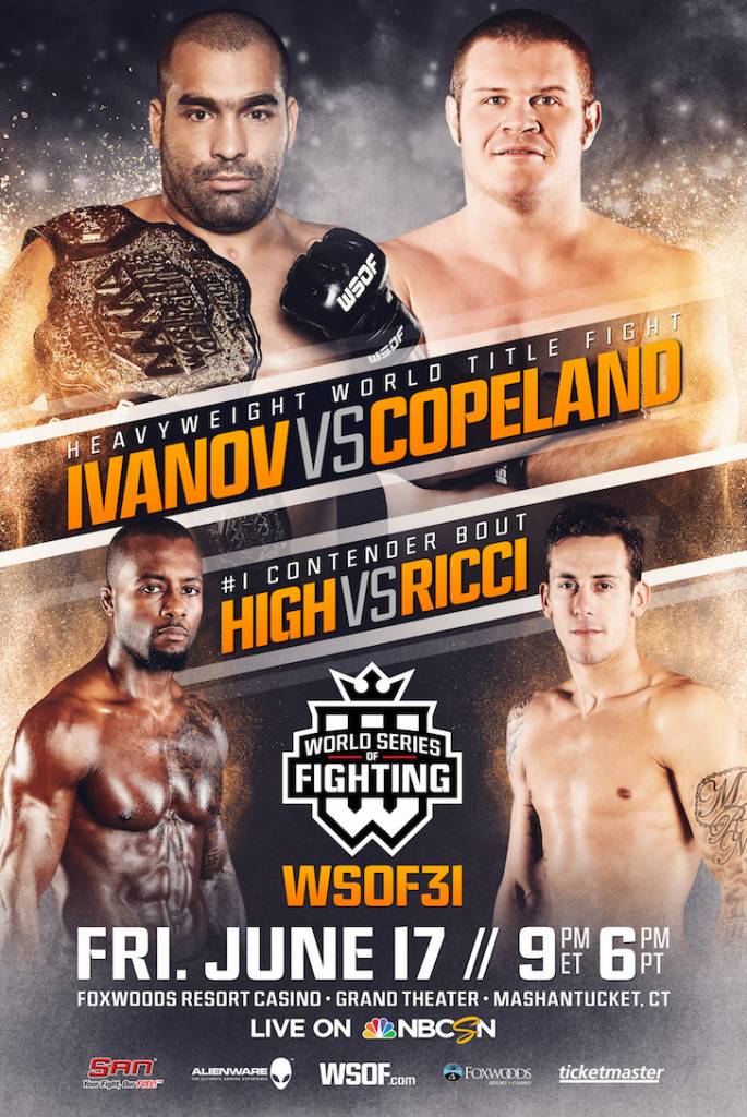 LAS VEGAS (April 12, 2016) –World Series of Fighting (WSOF.com) today announced the addition of three star-studded matchups to complete the main card for its WSOF31: Ivanov vs. Copeland world heavyweight championship Mixed Martial Arts (MMA) event, live on NBCSN at 9 p.m. ET/6 p.m. from Foxwoods Resort Casino in Mashantucket, Conn. on Friday, June 17.