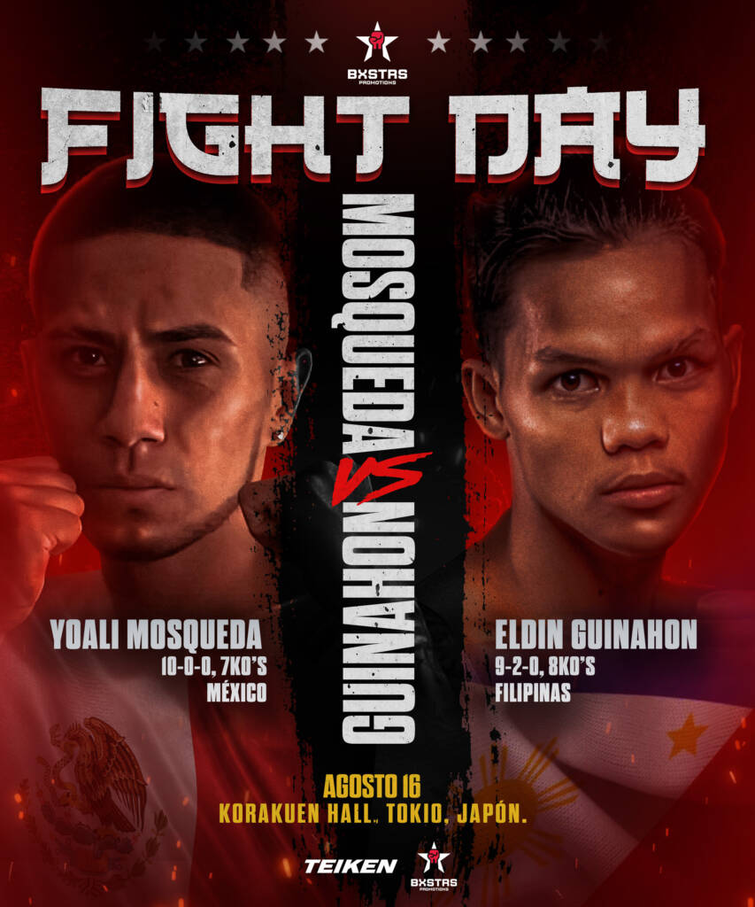 Yoali Mosqueda (10-0-0, 7 ko’s) y Eldin “Golden Boy” Ghinahon (9-2-0, 8 ko’s) se enfrentarán a 8 rounds en peso Mosca, en un duelo que se espera de poder a poder entre dos guerreros del ring que lo mismo ejecutan un boxeo de alta escuela, técnico y con recorrido de ring, que se paran a fajar y hacen valer el poder de puños, y además protagonizando un capítulo más de la rica rivalidad boxística entre México y Filipinas, en un terreno neutral pero de gran historia como lo es Japón.