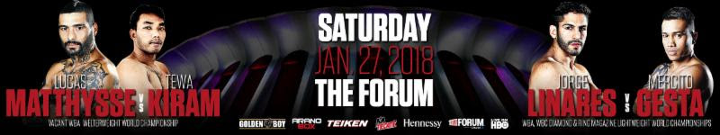 Matthysse vs. Kiram es un pleito a 12 episodios por el vacante campeonato mundial welter de la AMB presentado por Golden Boy Promotions en asociación con Arano Box y Galaxy Promotions. Linares vs. Gesta, es una batalla a 12 giros por los títulos mundial ligero AMB, Diamante CMB y Ring Magazine presentado por Golden Boy Promotions en asociación con Teiken Promotions. El evento es patrocinado por Tecate, “THE OFFICIAL BEER OF BOXING” y Hennessy, “Never Stop, Never Settle.” Los combates se llevarán a cabo el sábado 27 de enero de 2018 en el “Fabuloso” Forum de Inglewood, California, y serán televisados en vivo por HBO Boxing After Dark iniciando a las 10:30 p.m. ET/PT. El respaldo no televisado será transmitido por RingTV.com comenzado a las 3:00 p.m. PT/ 6:00 p.m. ET.