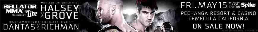 “Bellator: Halsey vs. Grove” takes place on Friday, May 15, at Pechanga Resort & Casino in Temecula, Calif. The night’s main card airs live on Spike TV at 9 p.m. ET (6 p.m. PT local time), while preliminary bouts stream on Spike.com.