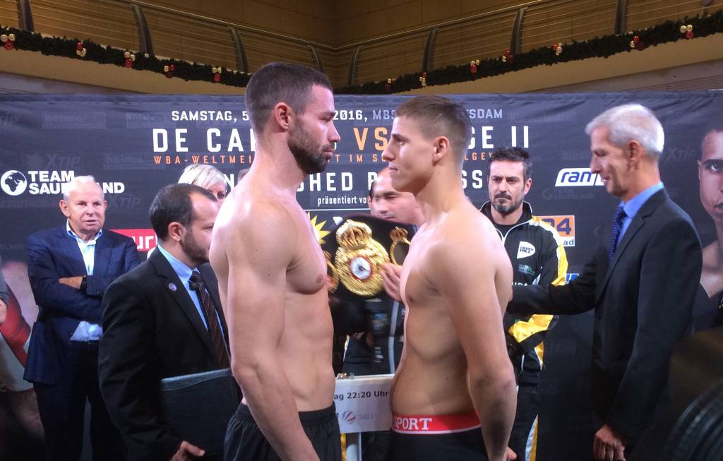 Tyron Zeuge (18-0-1, 10 KOs) and Giovanni De Carolis (24-6-1, 12 KOs) both made weight today ahead of their WBA World Super Middleweight title rematch tomorrow night at the MBS Arena in Potsdam, Germany, as did the undercard fighters.