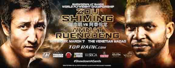MACAO (February 17, 2015) — The upcoming Chinese New Year will begin on February 19, 2015 — The Year of the Sheep. But Chinese boxing fans from around the world are hoping it will also usher in the beginning of The Shiming Dynasty. After winning three World Championships and two Olympic gold medals as an amateur,ZOU SHIMIING, in only his seventh professional fight and 23 months removed from his professional debut, will be challenging undefeated International Boxing Federation (IBF) flyweight world champion AMNAT RUENROENG. The Showdown at Sands: Zou Shiming vs. Amnat Ruenroeng will headline an exciting all-action world championship boxing event, Saturday, March 7, at The Venetian® Macao‘s Cotai Arena.