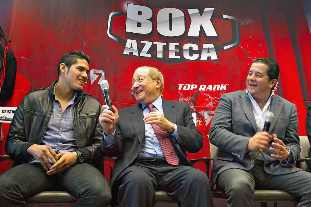 (De izquierda a derecha) Gilberto Ramírez, Bob Arum y Fernando Beltrán